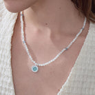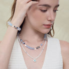 Oceana—a name of Greek origin, inspired by the serene beauty of the sea. This necklace captures that spirit with soft, ocean-breeze tones, featuring chalcedony abacus beads and other carefully chosen gemstones. A delicate aquamarine pendant completes the design. For a complete, coordinated look, pair it with matching accessories from our Dawn Sea Collection.