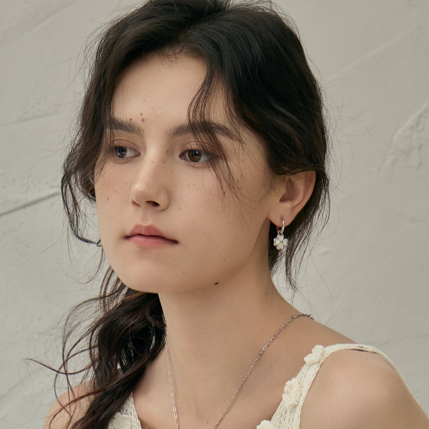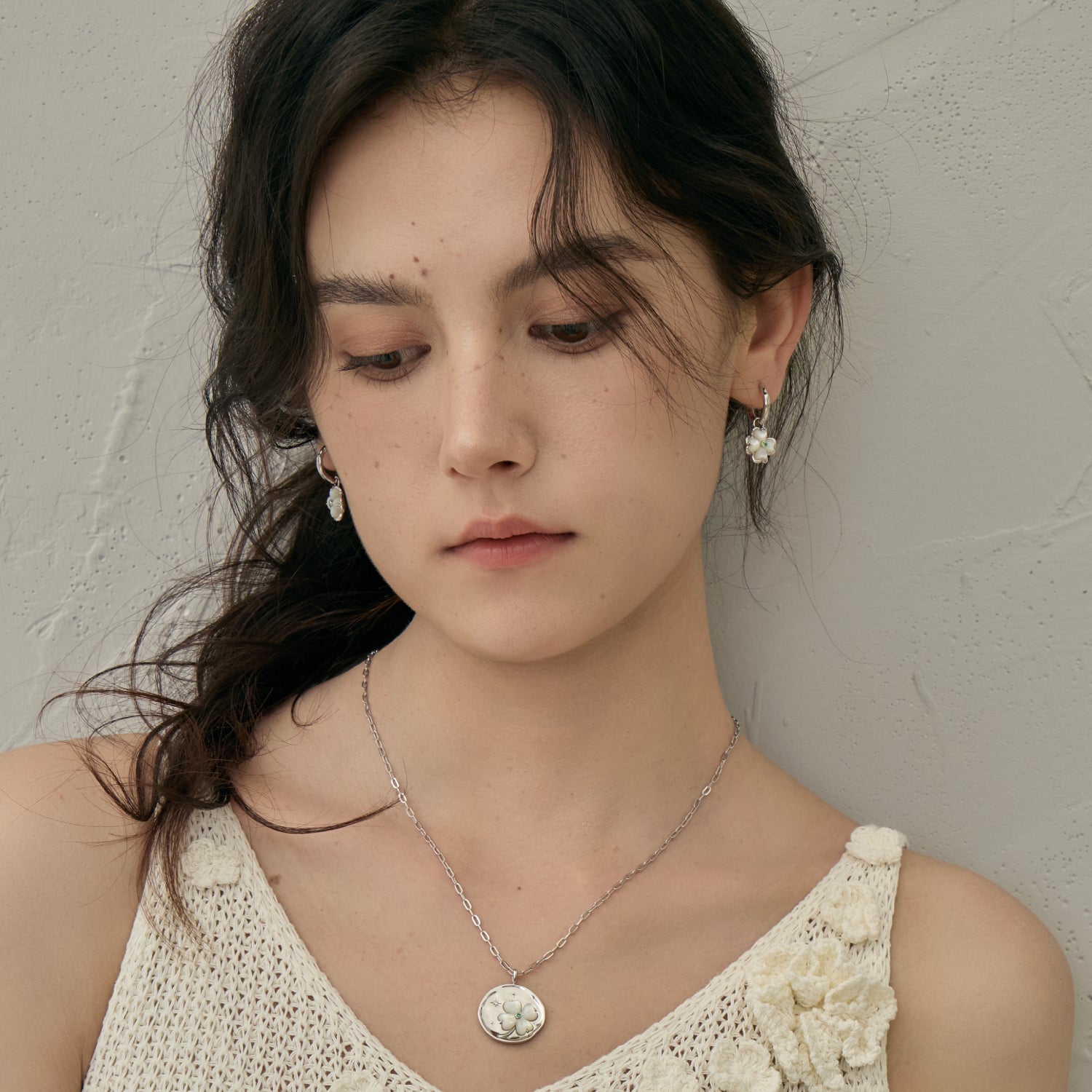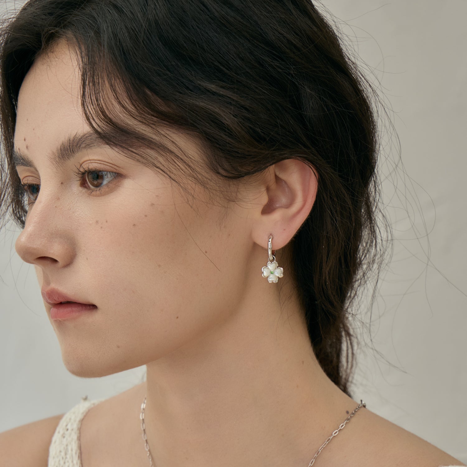 Pendientes con dije de trébol de perla en flor
