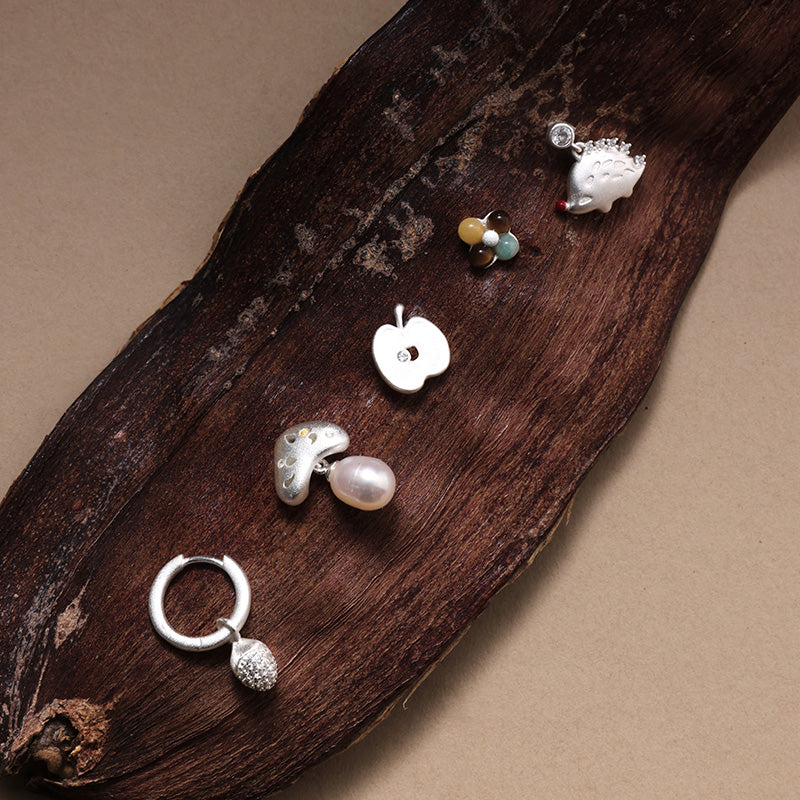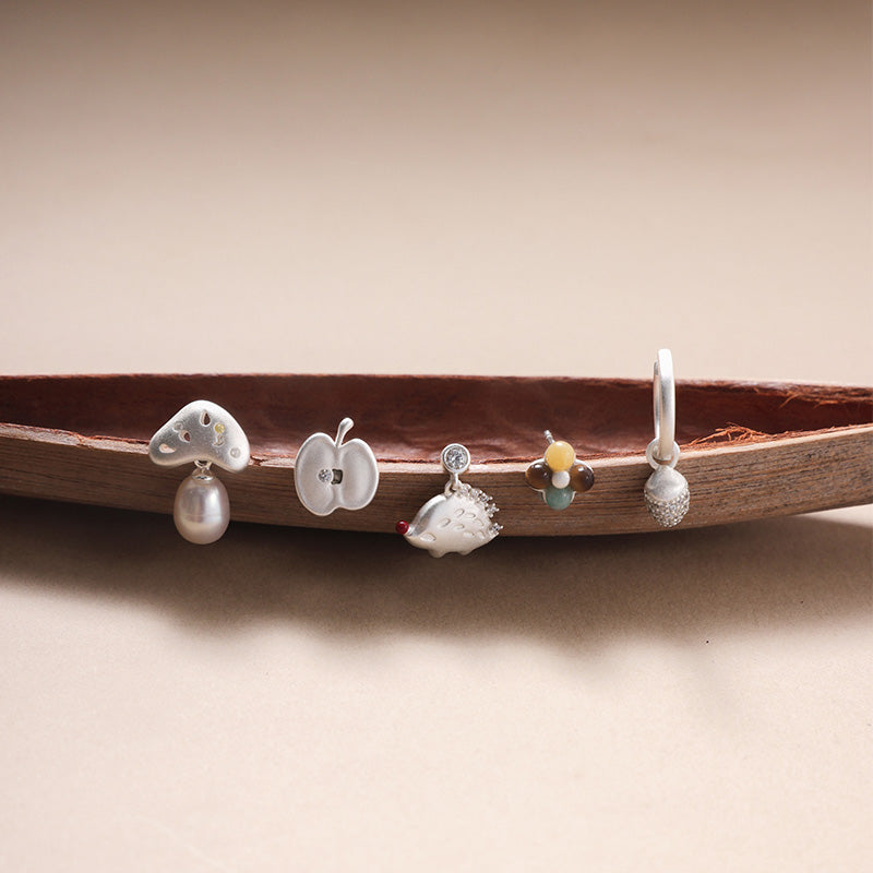 Set includes 5 studs: Mini Berry Stud, Mini Hedgehog Std, Mini Apple Stud, Mini Mushroom Stud and Mini Pine Cone Stud.