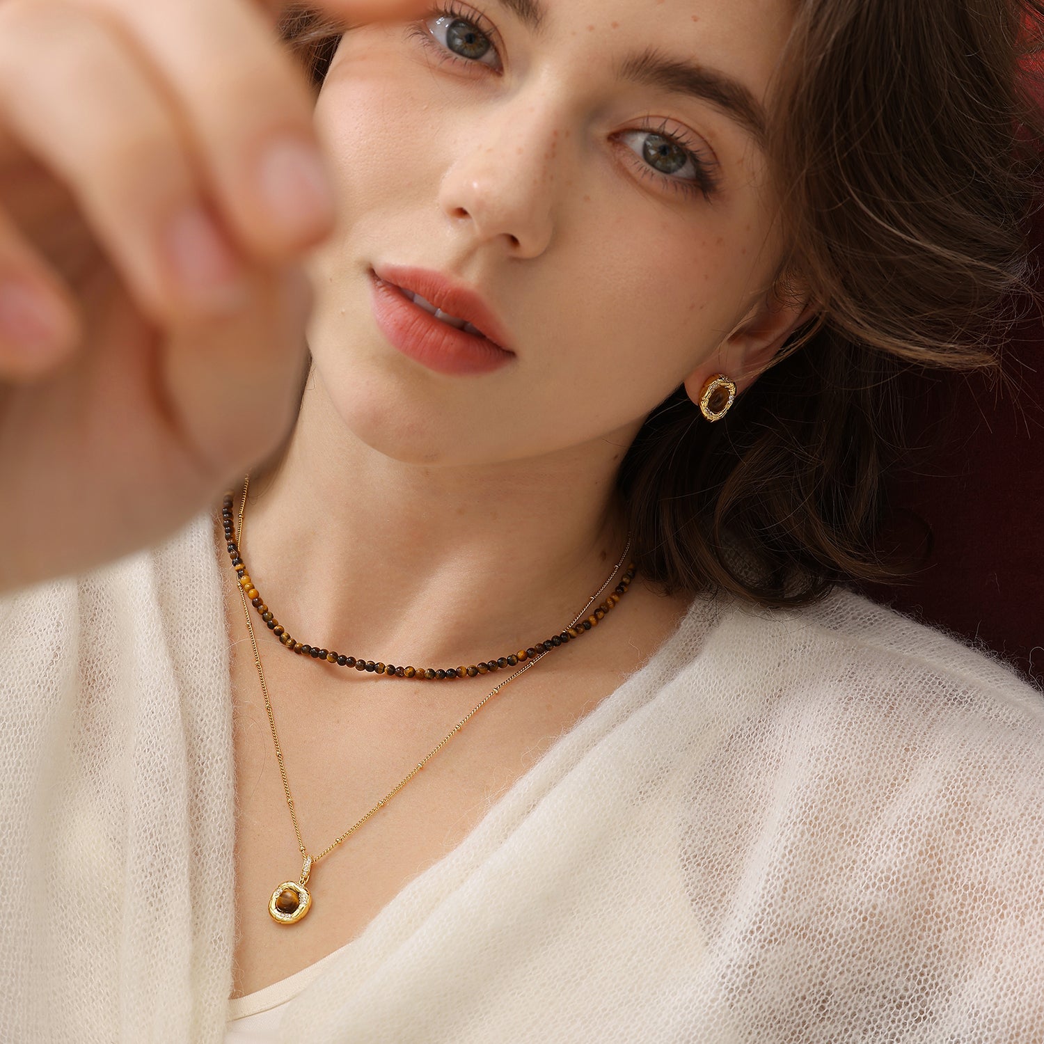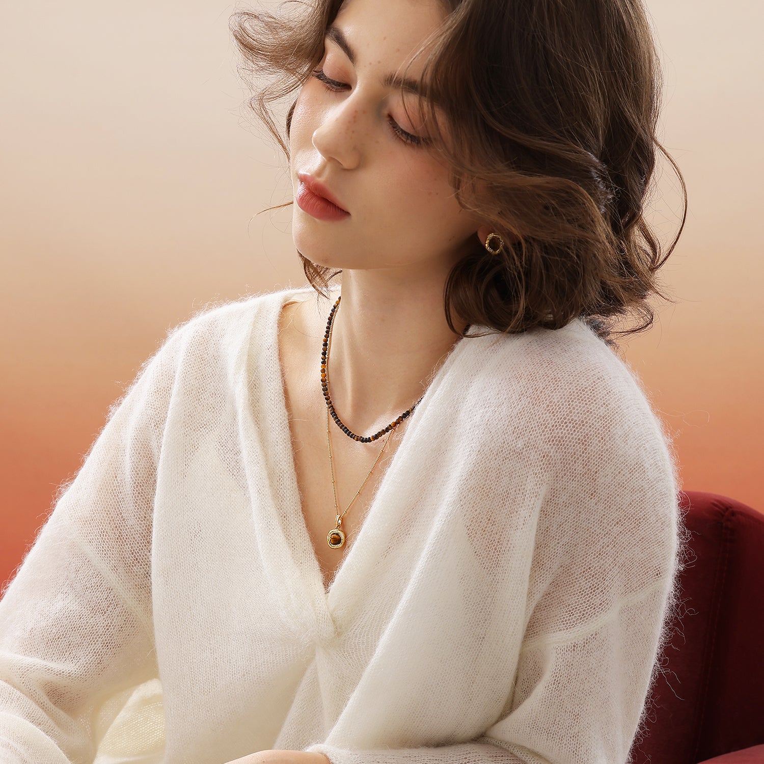 Este conjunto de collares gemelos incluye un collar de cuentas y un collar de cadena de bolas con colgante. El collar de cuentas está disponible en tres materiales: perla, ágata y ojo de tigre, cada uno con sus propias ventajas. Su diseño versátil permite múltiples maneras de lucir este elegante collar de cadena doble.