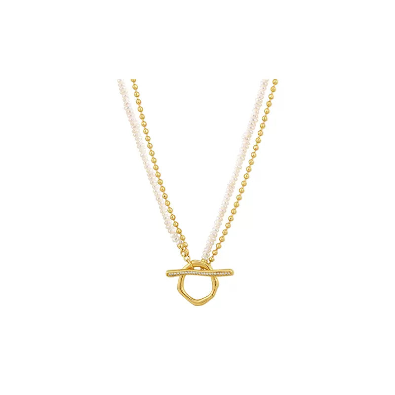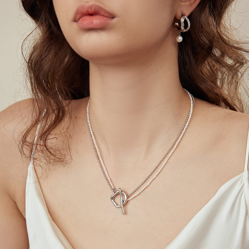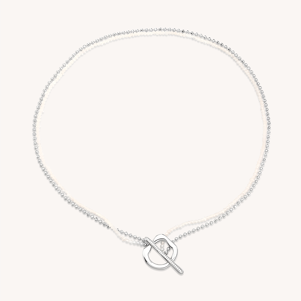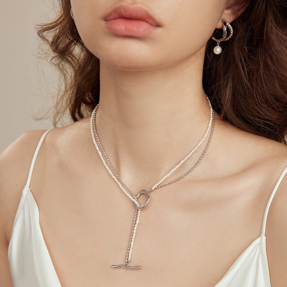 El popular collar de perlas de arroz de este año combina versatilidad y elegancia. Con cadenas entrelazadas de doble capa que le dan profundidad y delicadas cadenas de bolas metálicas multifacéticas que brillan, ofrece cuatro opciones de estilo: con cierre de barra en T en la parte trasera para un look delicado, con cierre de barra en T en la parte delantera para un toque informal, con cadena en Y para mayor elegancia, o ajustado como gargantilla para un estilo dulce o atrevido. Ideal para el día a día con un toque de ingenio.