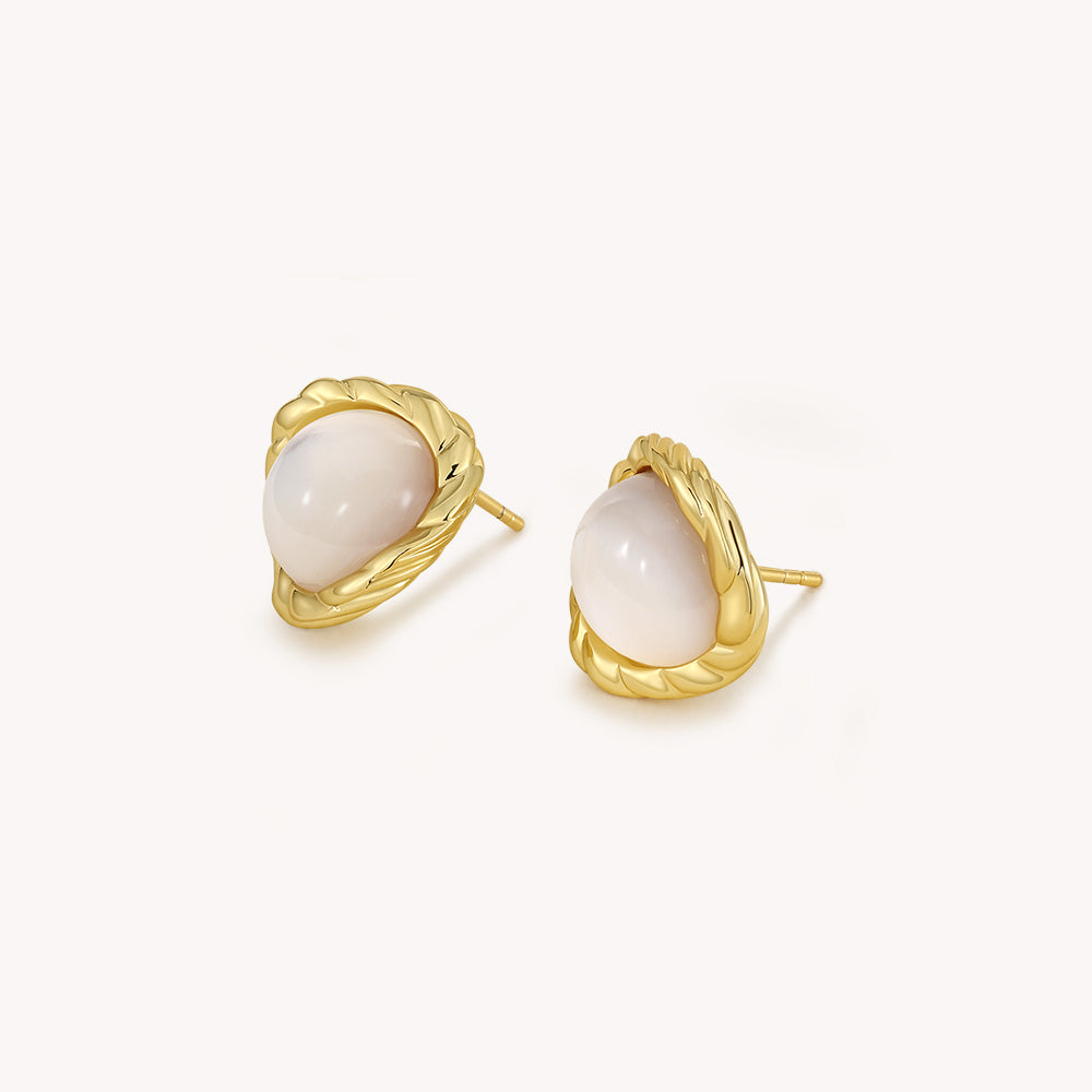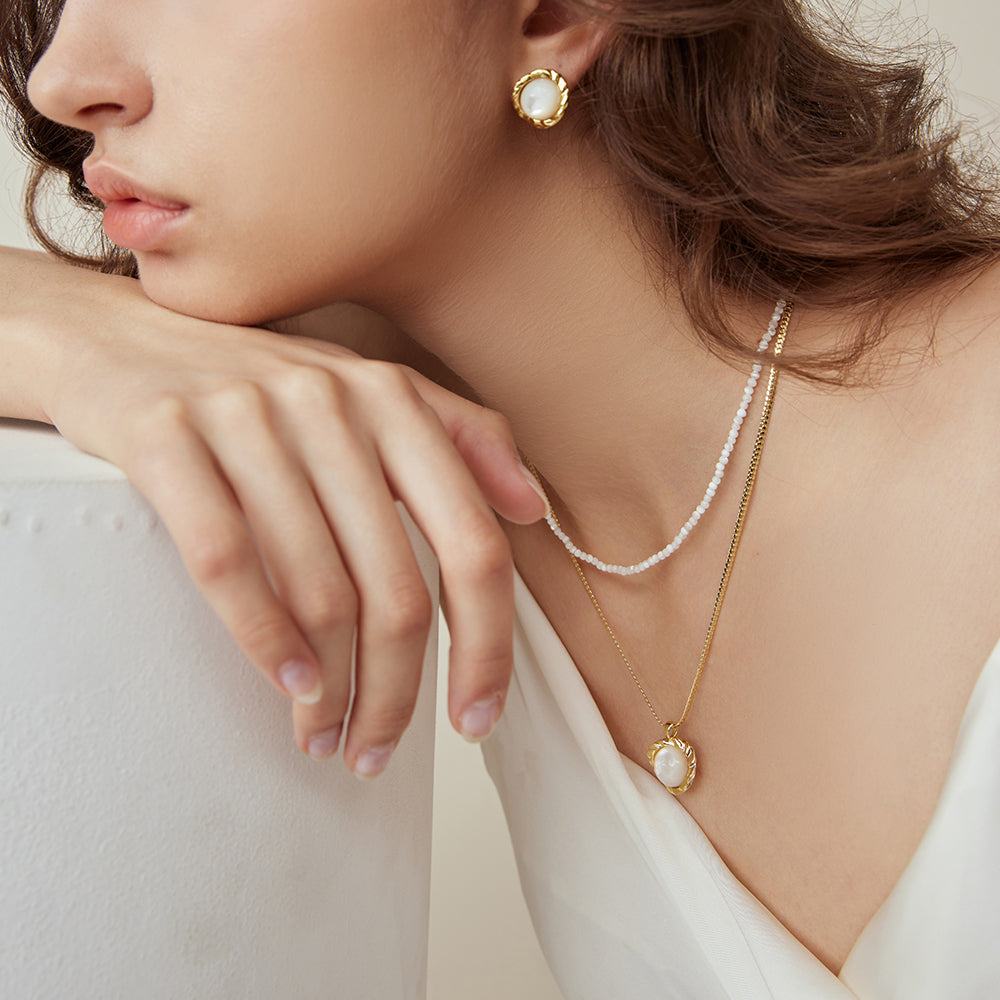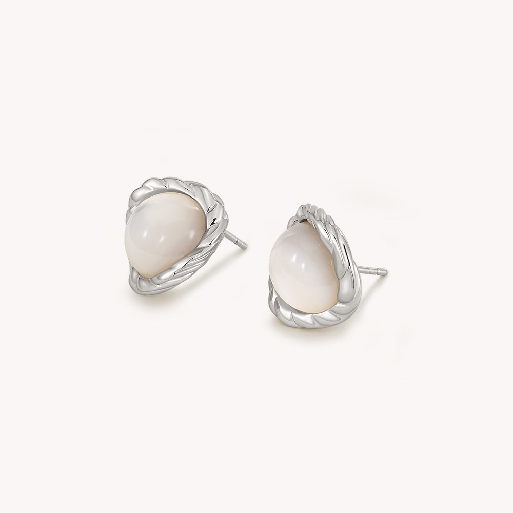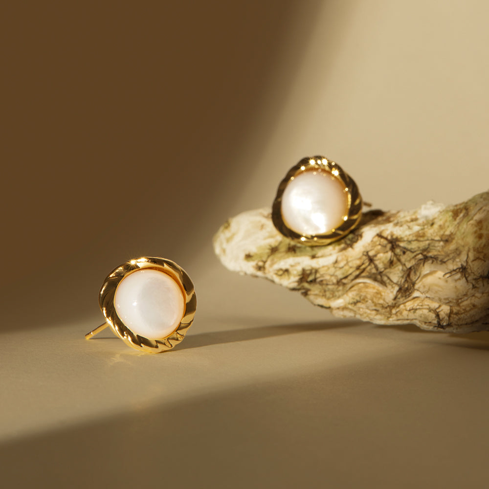 Ideal para el trabajo, este conjunto incluye unos discretos pendientes de botón de nácar natural y un borde metálico plisado para mayor delicadeza. El nácar presenta un brillo variable según la luz, y los pendientes están disponibles en dos tamaños: pequeño y grande.